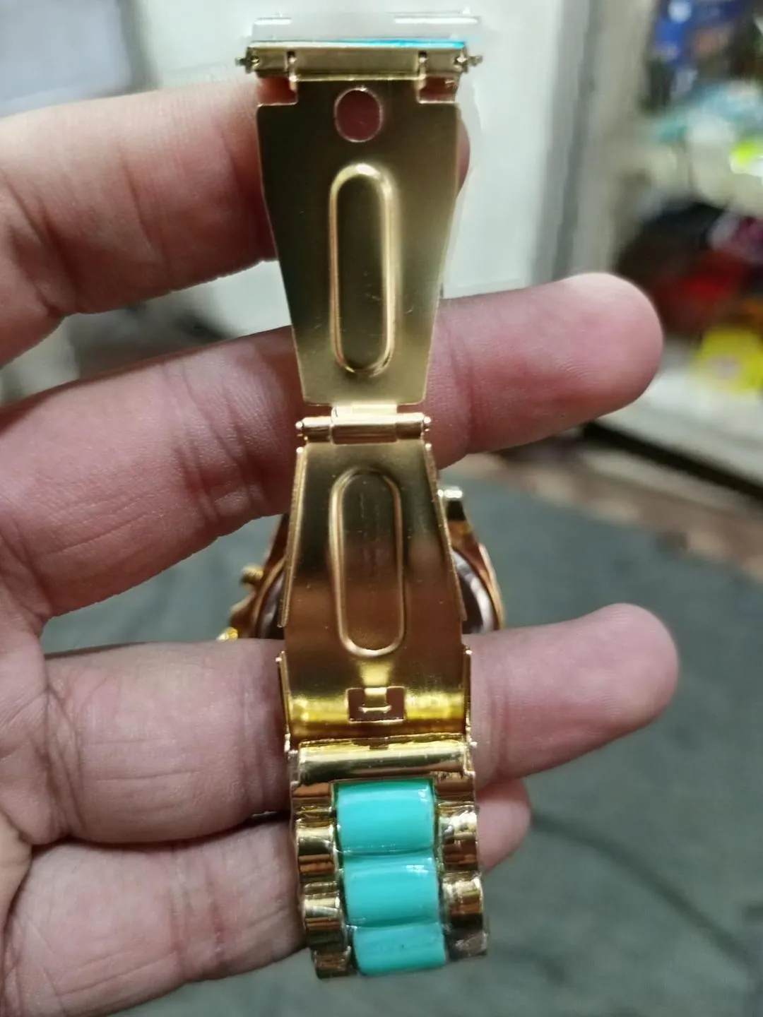 Regarding the construction, the watch features an integrated two-tone link bracelet. This unique strap combines gold-tone outer links with teal turquoise center links for a high-end feel. Because the bracelet uses premium stainless steel and resin, it remains durable and comfortable on your wrist all day long. Additionally, the round watch case shape and sleek profile make it a versatile unisex option for any fashion enthusiast.