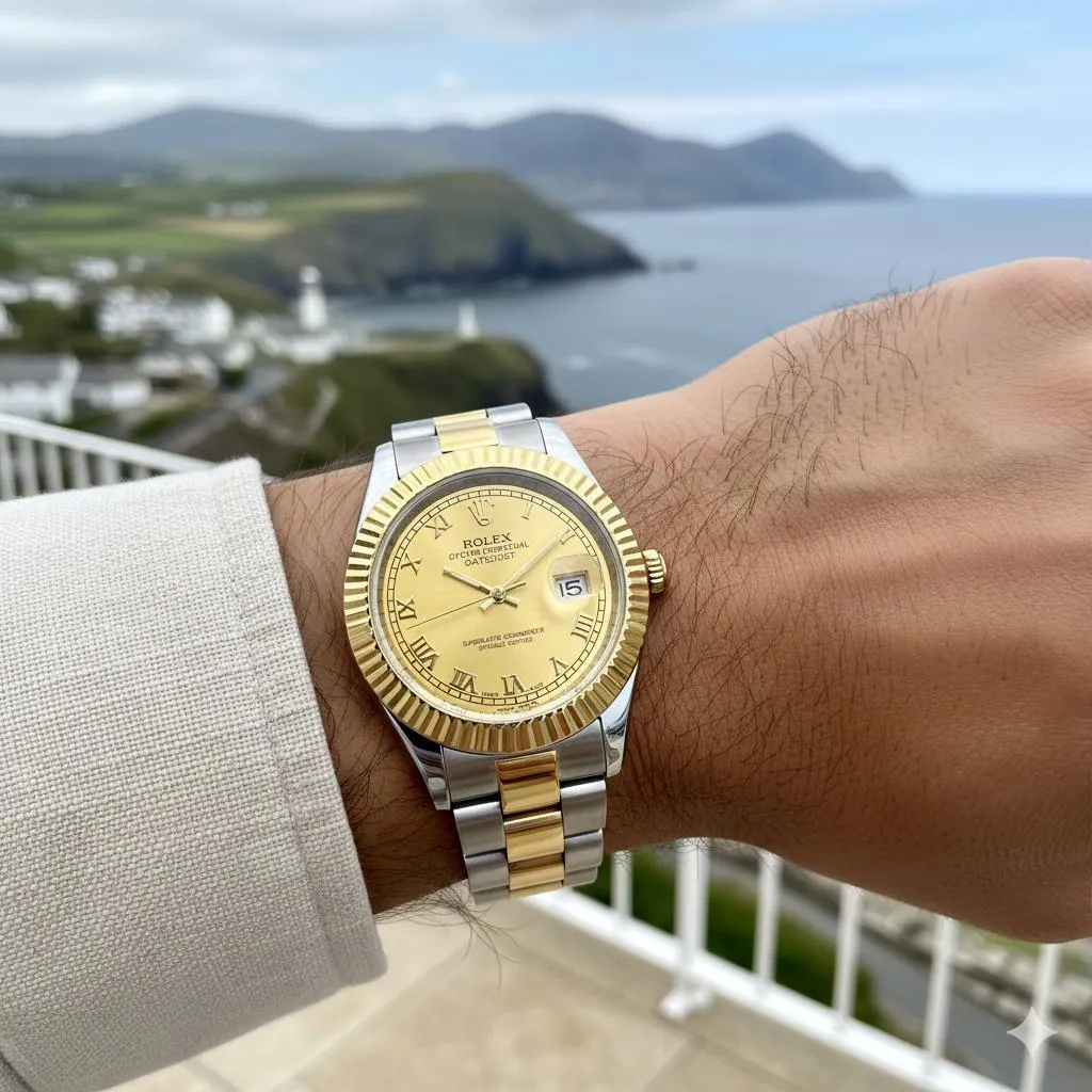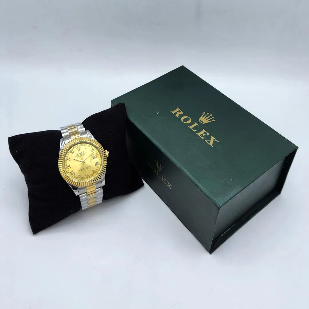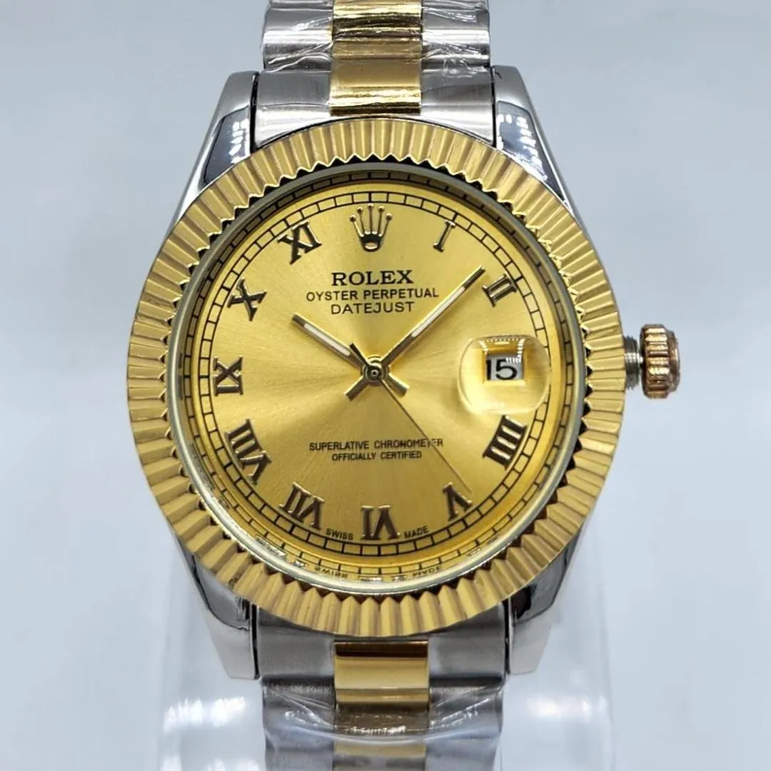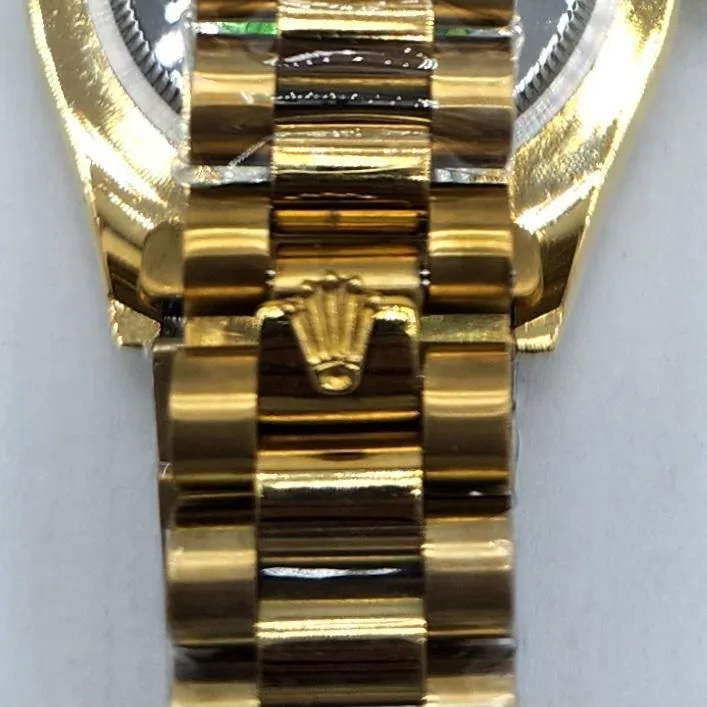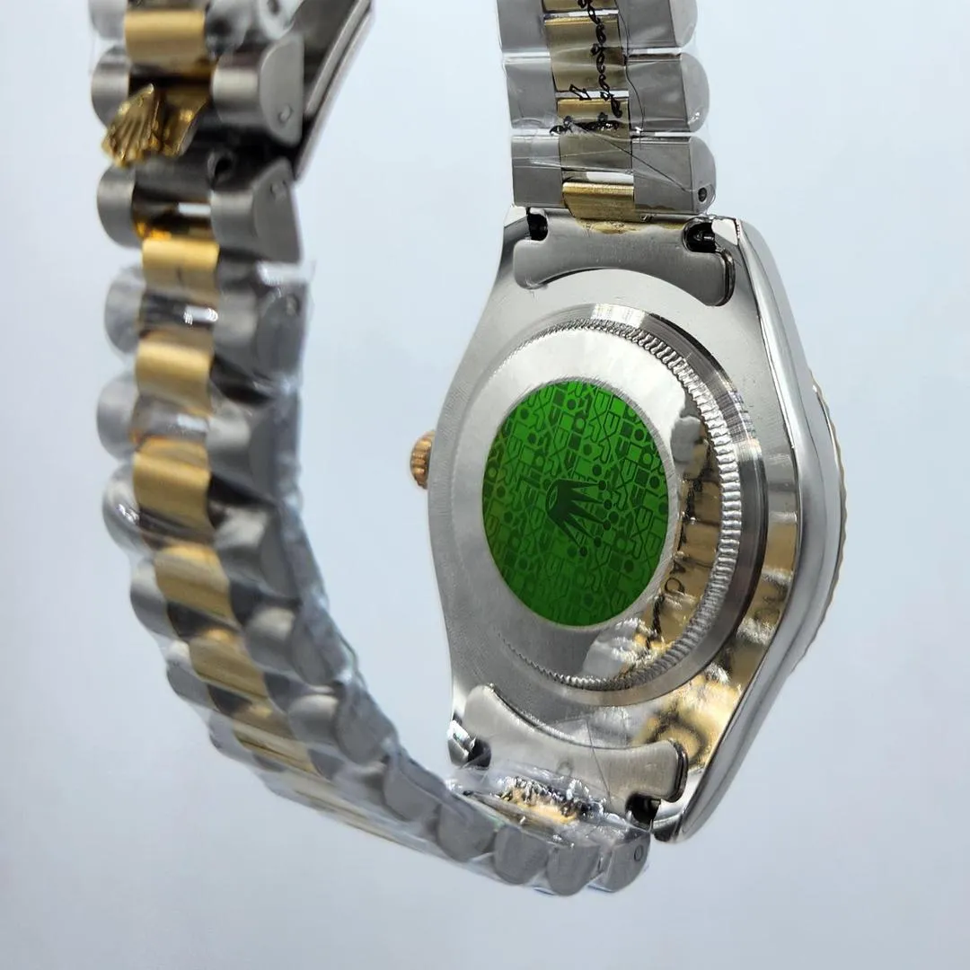 The Oyster Watch Gold Rolex Fluted Bezel is a true luxury masterpiece. Specifically, its rich olive green dial features elegant Roman numeral markers. The iconic fluted bezel captures light beautifully from every angle. Additionally, the premium gold President-style bracelet ensures a weighted, high-end feel. Furthermore, the high-quality automatic movement requires no batteries to function. Therefore, if you want a bold, classic timepiece, this watch is the perfect choice.